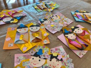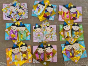 2024-02-26 ブログ ひなまつり製作 3月3日のひなまつりにむけて、Monthly craftのクラスでお雛様とお内裏様をつくりました。 和紙やゴールドの折り紙を使うととても華やかになりますね。 みんなそれぞれ、かわいいお顔を描いたらできあがり♡ とっても上手にできました! < BACK 一覧を見る NEXT >