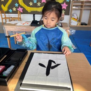 固形の墨に水をつけてすることで液体になるなんて、なんて不思議!と、最初はびっくりしていた子どもたちでしたが、今では随分お道具の扱い方にも慣れ、筆に墨をつけると心が落ち着くのか、静かに黙々と書いています。