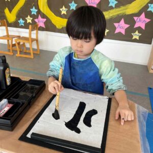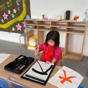 月に2回の書道のクラスでは、子どもたちが各々の書道セットを使い一枚一枚丁寧に書いていきます。