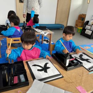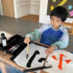 月に2回の書道のクラスでは、子どもたちが各々の書道セットを使い一枚一枚丁寧に書いていきます。