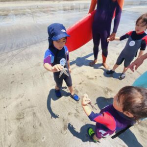 サーフィンのクラスでは、Floyd がこどもたちをひとりずつ海に連れ出し、ボードの上で遊んだり波に乗せてあげたりしています。なので、自分の番が来るまで、あとの子どもたちは一生懸命ビーチで砂あそび♡
