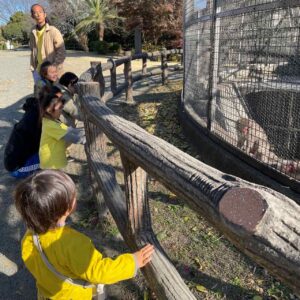 お天気も最高で、お顔とおしりが真っ赤なお猿さんたちや、アヒル、烏骨鶏、モルモットやうさぎもたくさんいて、子どもたちは目をキラキラさせながらかわいい動物たちを眺めていました!