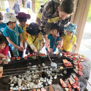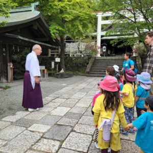 お寺や神社に行き、そのお寺や神社では、何百年前に何があったのかなど、昔のお話をきいたり、神社の境内で遊んだりするクラスになります。